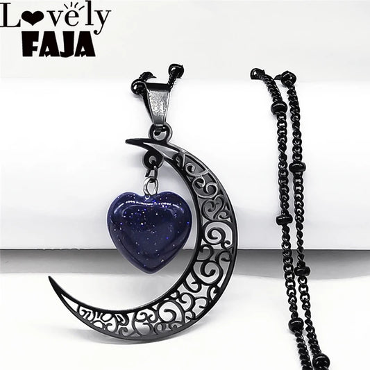 Colar de Pingente de Pedra Natural de Aço Inoxidável Feminino // Colar de Coração de Lua // Joias de Aço Inoxidável Joyeria N6325S03
