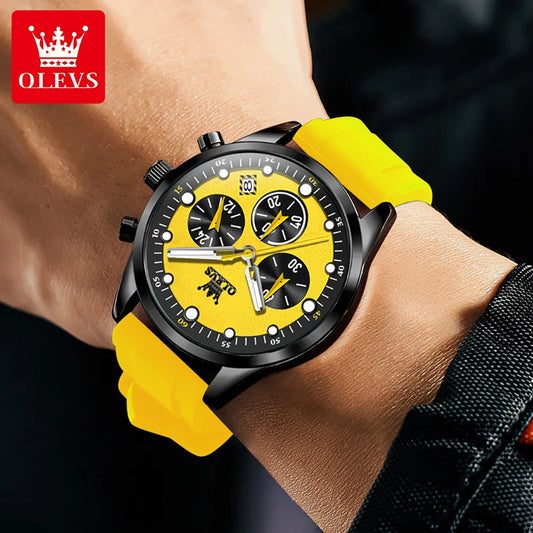 Relógios masculinos originais OLEVS, cronógrafo multifuncional, tendência da moda, pulseira de borracha amarela, luminoso, à prova d'água, relógio de quartzo masculino