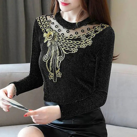 Camiseta Elegante Sexy c/ Aplique Floral // Pullovers Meia Gola Alta c/ decoração Tridimensional // Primavera/Outono 2024