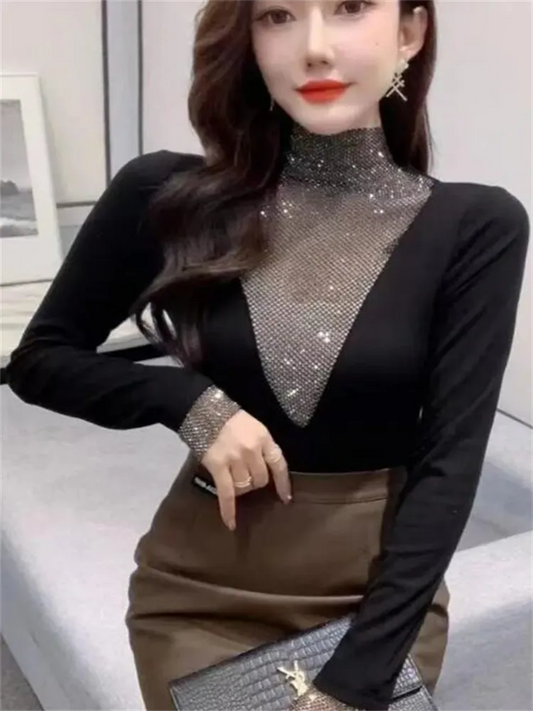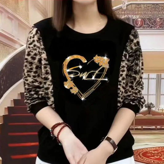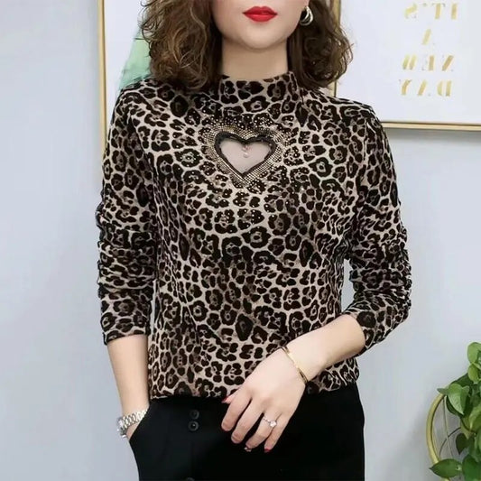 Camiseta Feminina Meia Gola Alta Manga Comprida Impressa // Outono/Inverno // Roupa Feminina Vazada Coreana Leopardo c/ Diamantes