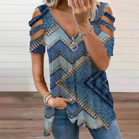 Camiseta Elegante c/ Impressão Floral, Zíper e com Decote em V // Verão Feminino Oversized 2023 // Roupas Femininas Casuais Sexy Slimtop // Feminino Plus Size (TAM Gde)