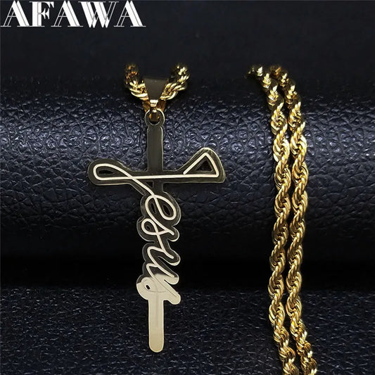 Colar Longo c/ Cruz de Aço Inoxidável AFAWA 2024 // Jesus // Masculino Cor de Ouro // Linda Jóia AFAWA Colares & Pingentes Para Proteção e Deleite!!!