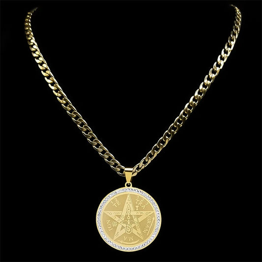 Amuleto Pentagrama Judaico // Tetragrammaton Hebraico // Colar da Fortuna para Homens de Aço Inoxidável Cristal / Ouro // Jóias Colares NZZZ499