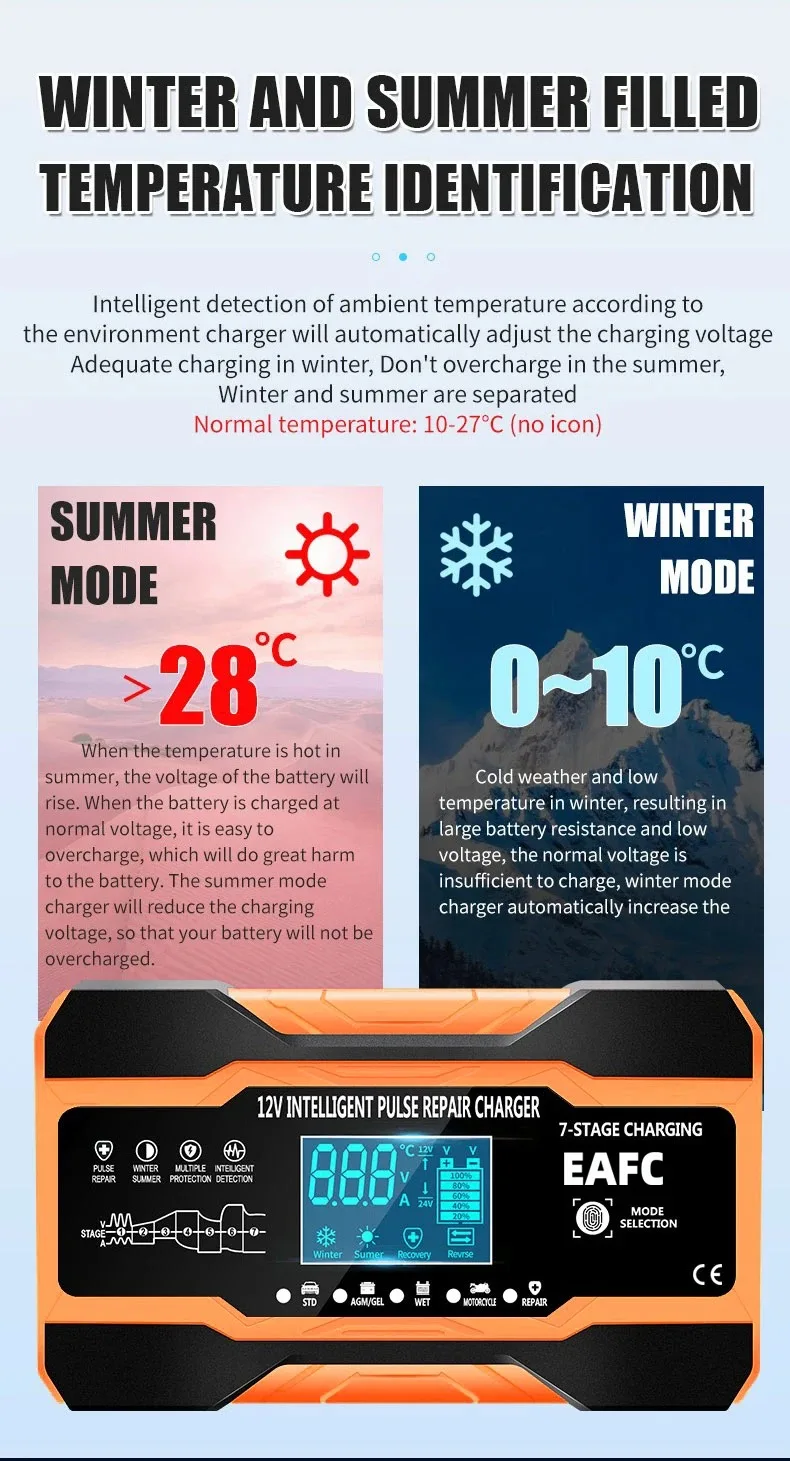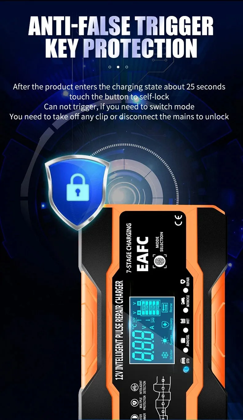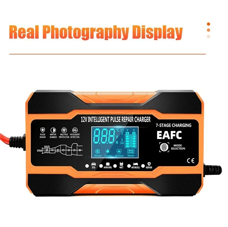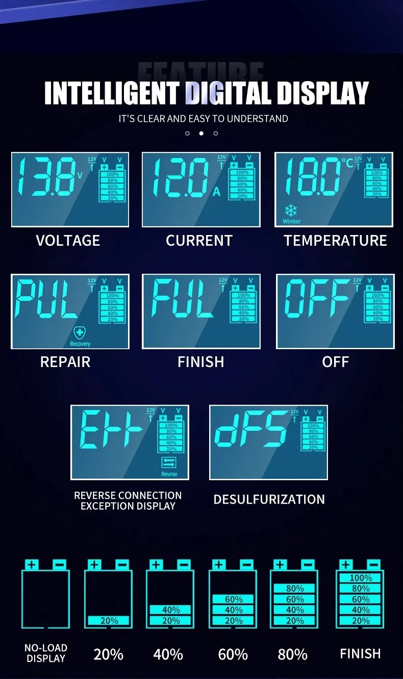 Carregador de Bateria de Carro 12V 12A // Carregamento de 7 Estágios // Reparo de Pulso para Baterias de Carro // Para AGM GEL // Chumbo-ácido úmido // Display LCD