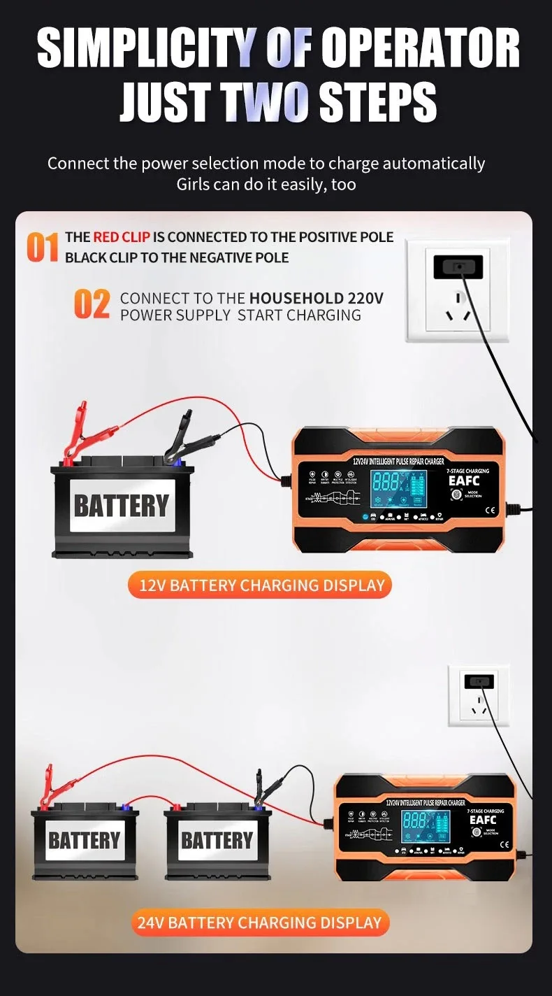 4. Os carregadores são adequados para a maioria dos tipos de baterias, incluindo baterias de cálcio, gel e AGM, além de baterias úmidas. Eles também podem ajudar a restaurar baterias descarregadas e sulfatadas.