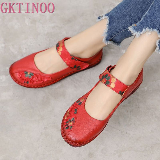Sapatos Baixos e Macios de Bico Redondo Vintage GKTINOO// Design de Flores da Moda Primavera // Couro Genuíno Mocassim Feminino Tamanho Grande