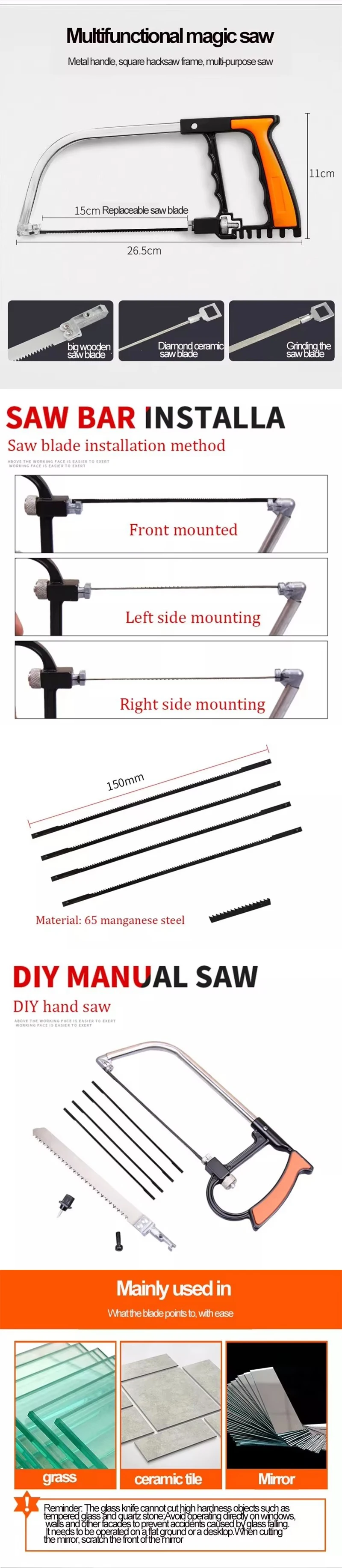 Esta serra manual é tão afiada que se adapta à maioria dos materiais. Por exemplo, você pode usá-la para serrar vidro duro, assim como madeira firme. Também é adequada para ligas metálicas, plástico, borracha, bambu, metais macios, aço inoxidável, azulejos, etc.