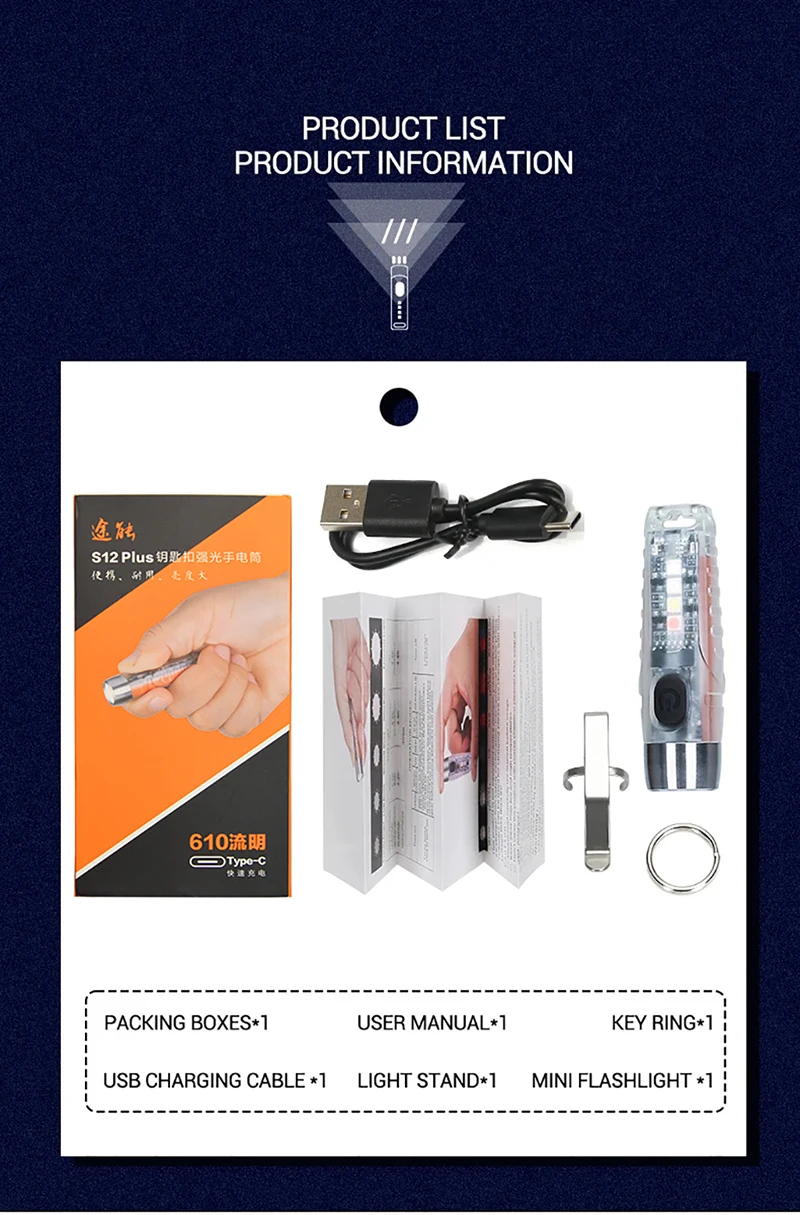 Lanterna portátil TUNNAGE S12 PLUS, super brilhante, 600 lúmens, à prova d'água, com LED, tipo chaveiro, bateria integrada e fecho magnético.