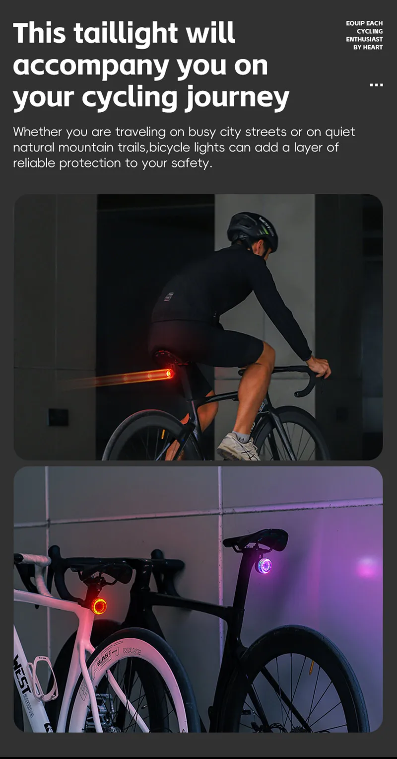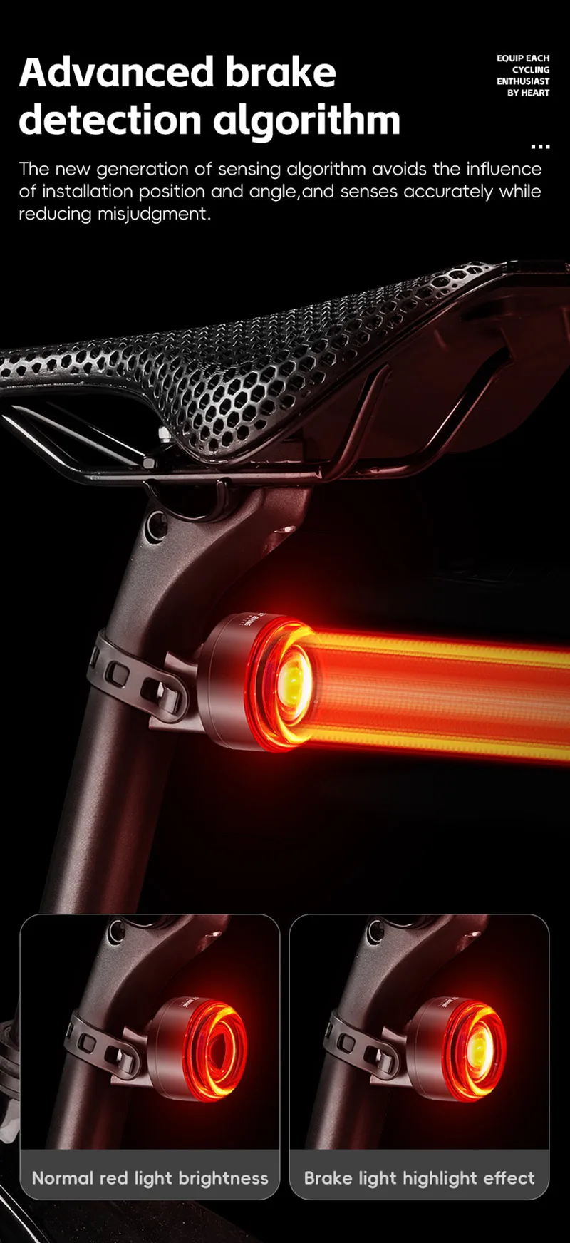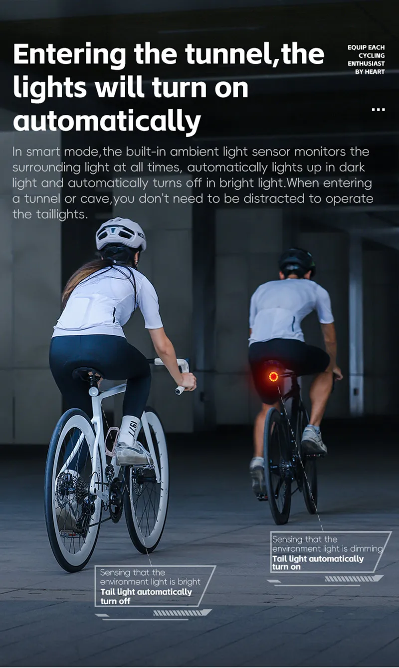 No modo inteligente, o sensor de luz ambiente integrado monitora a luz do ambiente o tempo todo, acende automaticamente em luz escura e desliga automaticamente em luz forte. Ao entrar em um túnel ou caverna, você não precisa se distrair para operar as luzes traseiras.