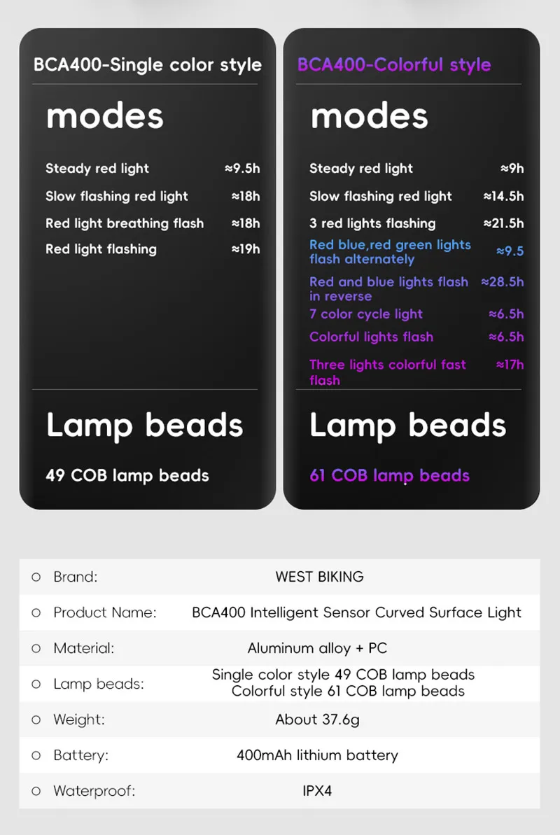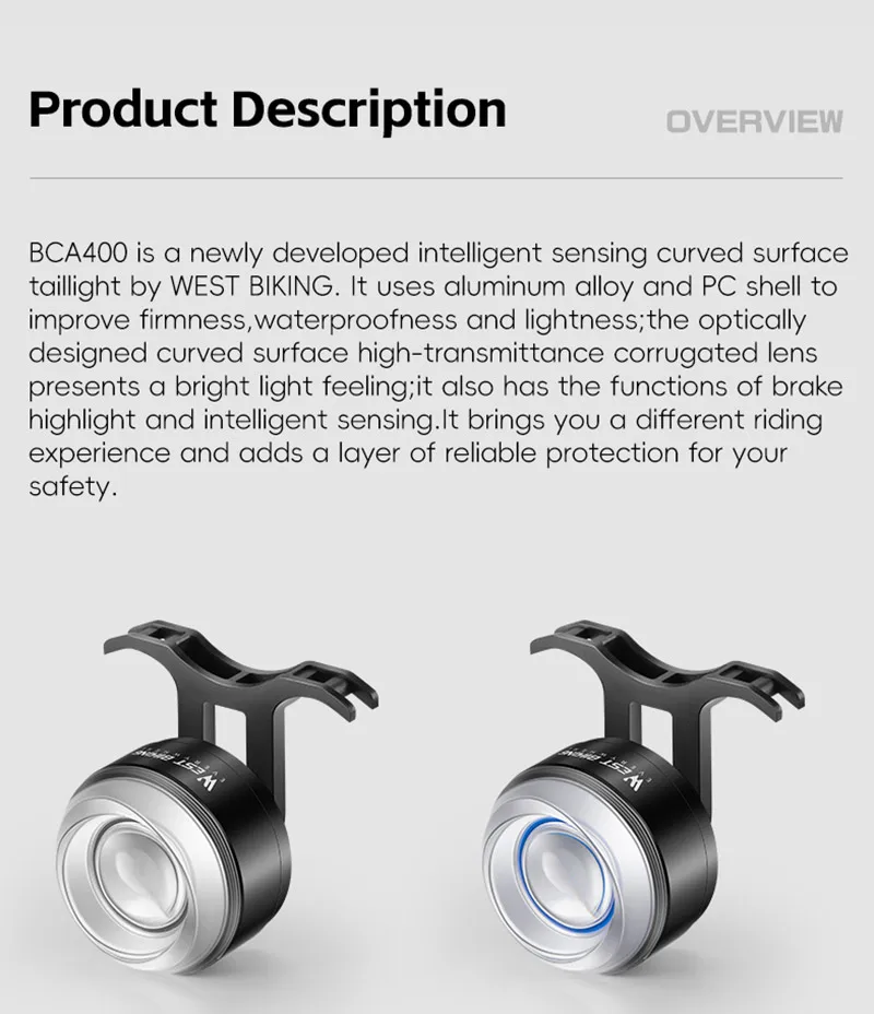 O BCA400 é uma lanterna traseira de superfície curva de detecção inteligente recentemente desenvolvida pela WEST BIKING. Ela usa liga de alumínio e revestimento de PC para melhorar a firmeza, a impermeabilidade e a leveza; uma lente corrugada de alta transmitância de superfície curva projetada opticamente apresenta uma sensação de luz brilhante; ela também tem as funções de destaque de freio e detecção inteligente. Ela traz a você uma experiência de pilotagem diferente e adiciona uma camada de proteção confiável para sua segurança.