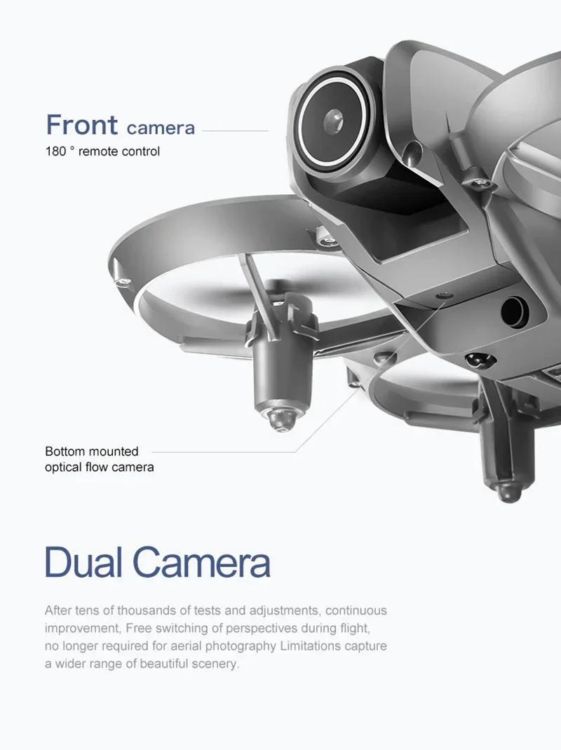 Cima/Baixo/Frente/Trás, Curvatura para a Esquerda/Direita, Voo Lateral, Luz LED, Rolagem Acrobática de 360°, Modo Headless, Retorno Automático com Um Clique, Modo de Manutenção de Altura WiFi FPV, Câmera Dupla comutável, Suporta Fotografia Paisagem/Retrato/Head-Up, Câmera Elétrica Ajustável em 180°