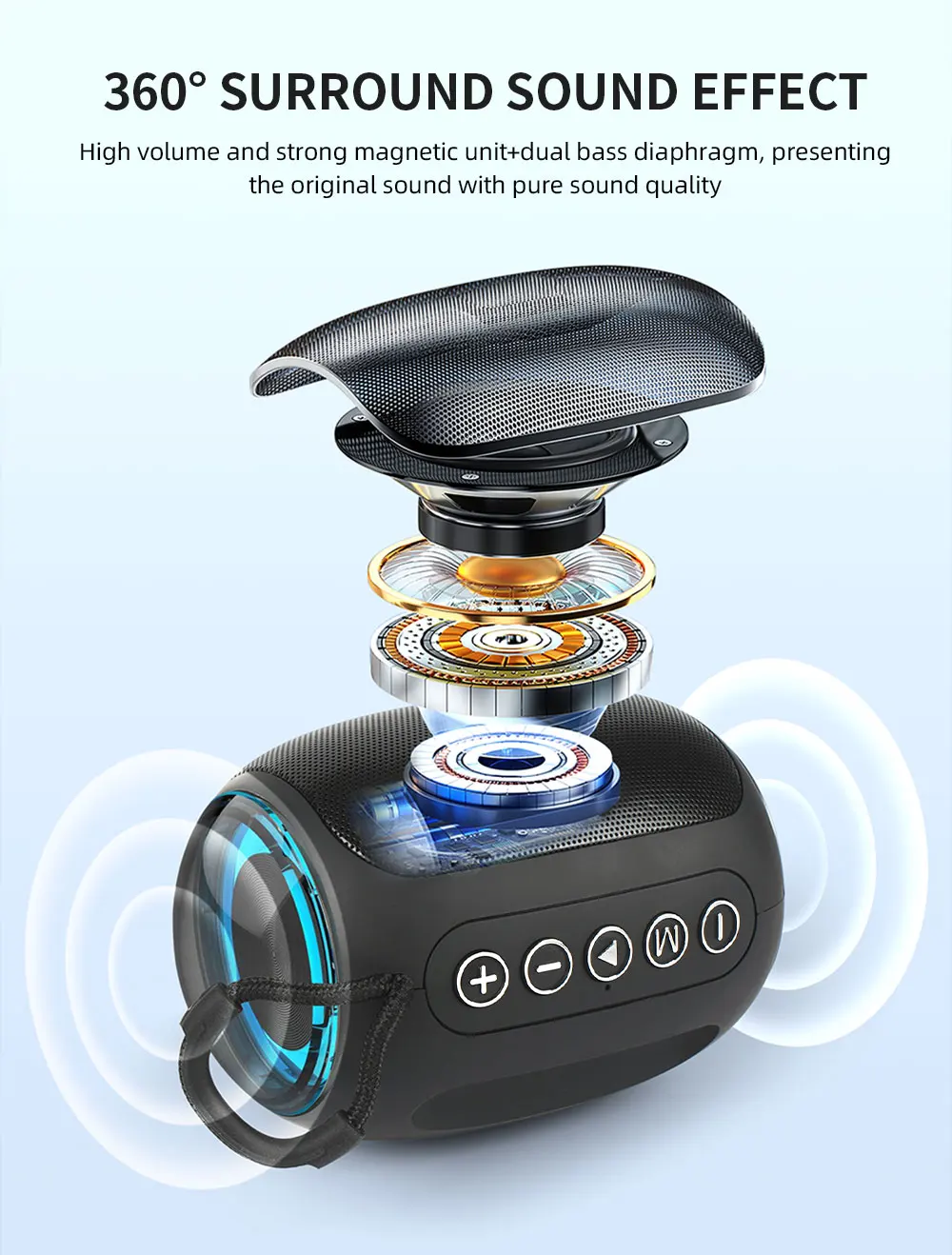 1. Efeito de som surround de 360 graus: Adotando uma unidade magnética potente de alto volume e um diafragma duplo de graves, o som original apresenta uma qualidade sonora pura.